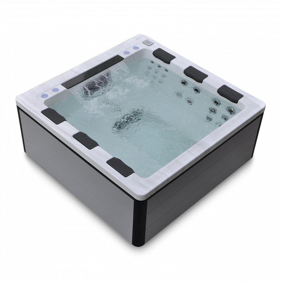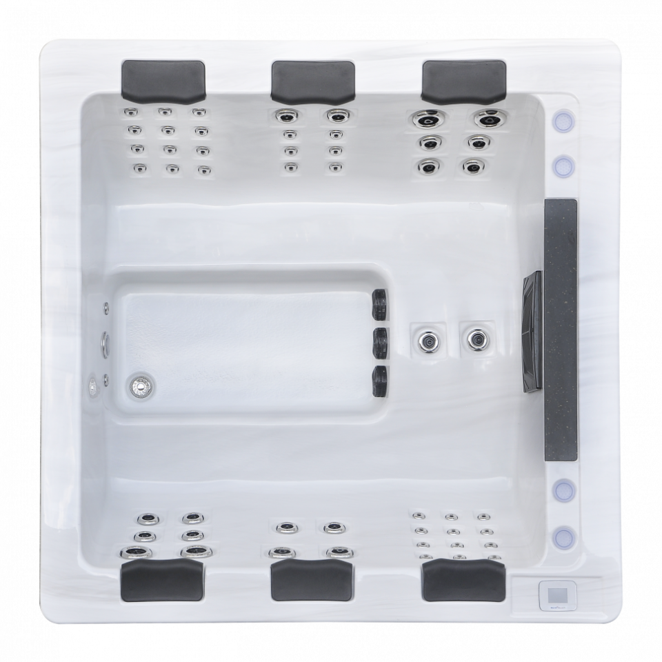 Просторный квадратный SPA размером 2200×2200×960 мм с уникальной 6-местной конфигурацией – идеальное решение для отдыха в кругу друзей или семьи, предлагая максимальный комфорт и расслабление.