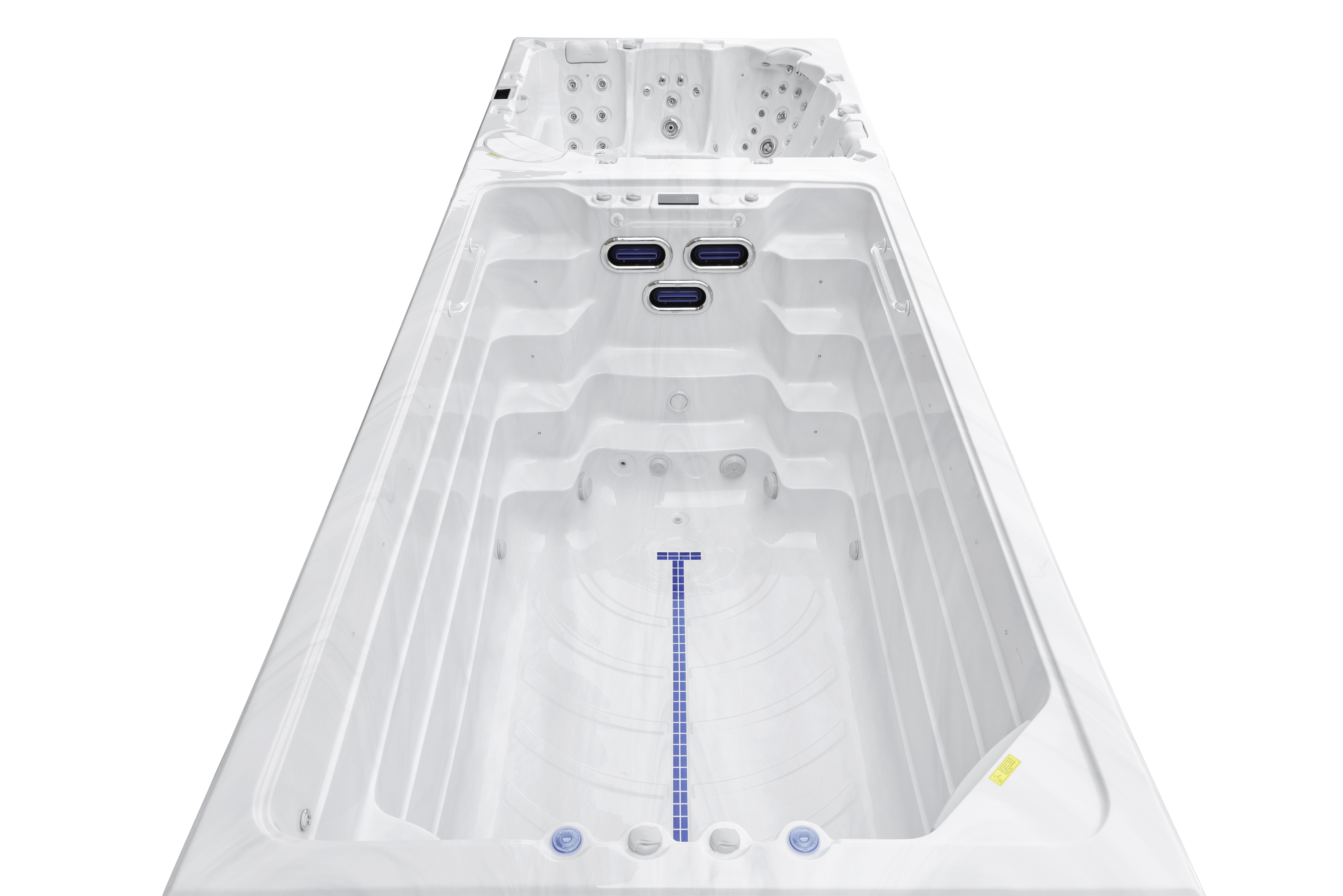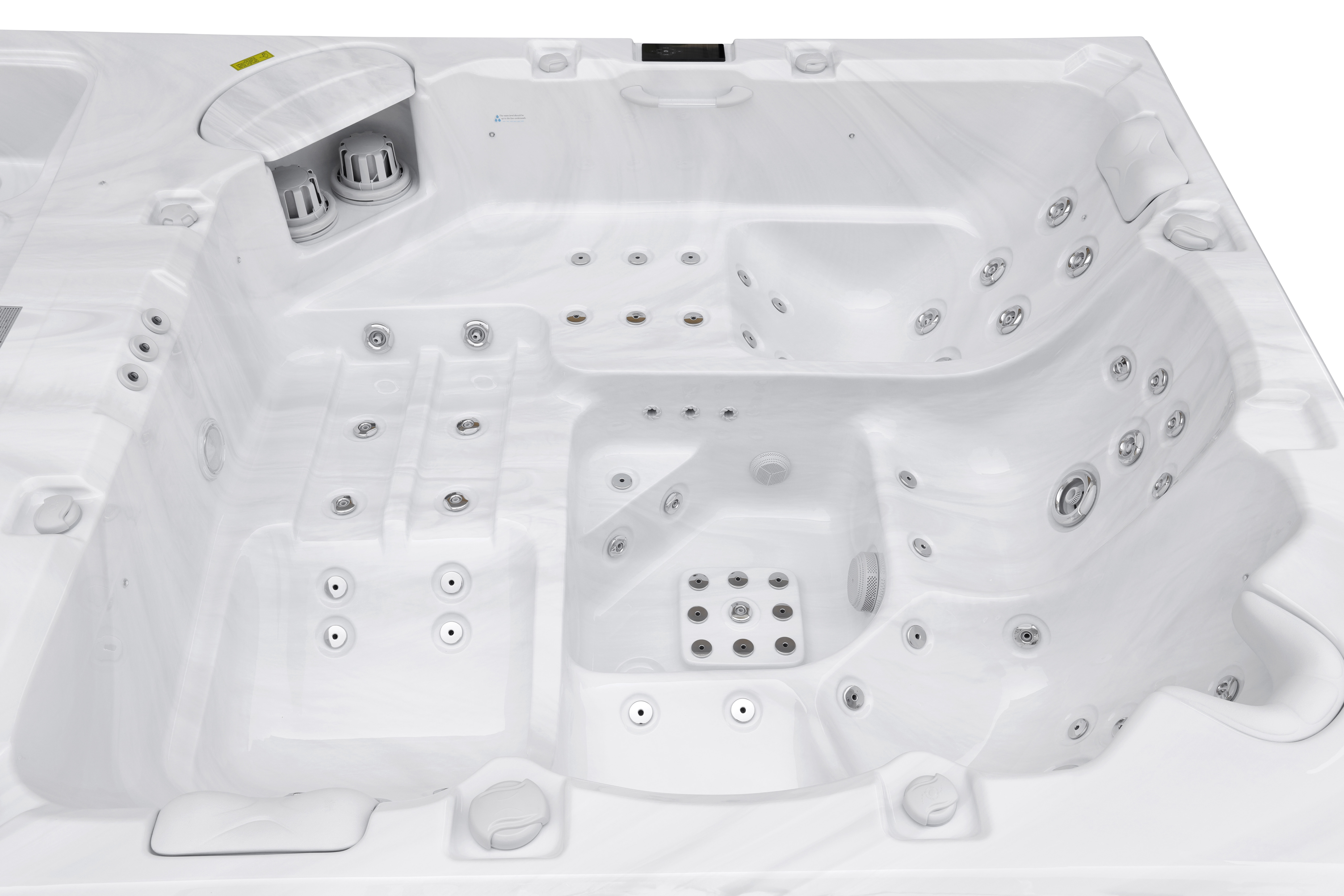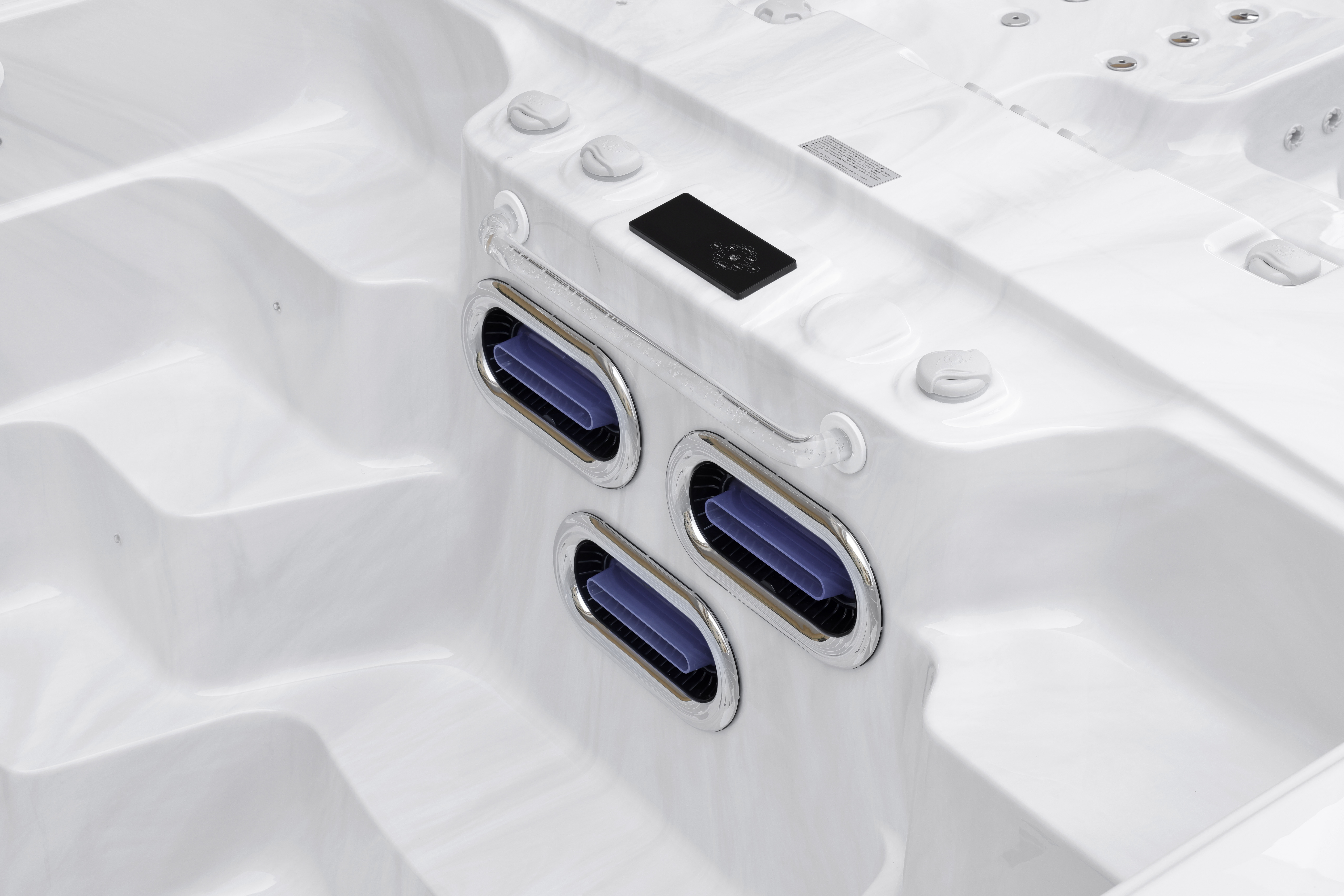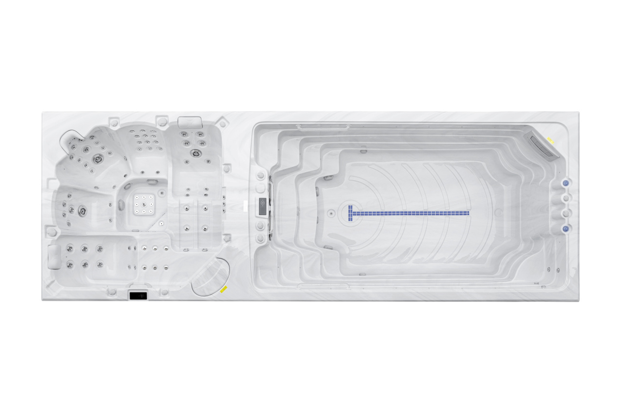 Четыре мощных насоса (два по 2,2 кВт, один 2,2 кВт и один 2,9 кВт) работают в разных зонах, обеспечивая интенсивный массаж 92 форсунками. Уникальная конфигурация гарантирует мощные водные потоки для эффективного массажа и комфортного плавания.